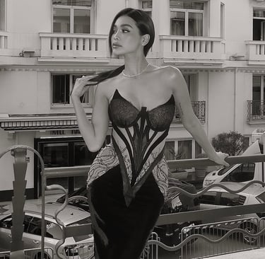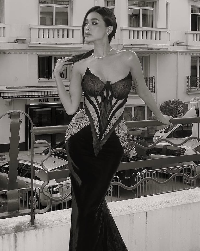 At Cannes, Praewwanich Ruangthong captivated onlookers with two stunning outfits. One of her remarkable appearances featured a sleek, form-hugging gown adorned with shimmering sequins and beads, reflecting the light beautifully as she moved. The gown's simple design highlighted her natural grace and tall stature. Her softly curled hair added to the sophisticated vibe of her look. With youthful, glowing makeup that emphasized her well-defined eyes and a subtle lip color, she complemented the gown's elegance perfectly. Praewwanich's fashion choices embodied a wonderful mix of contemporary style and understated sophistication.