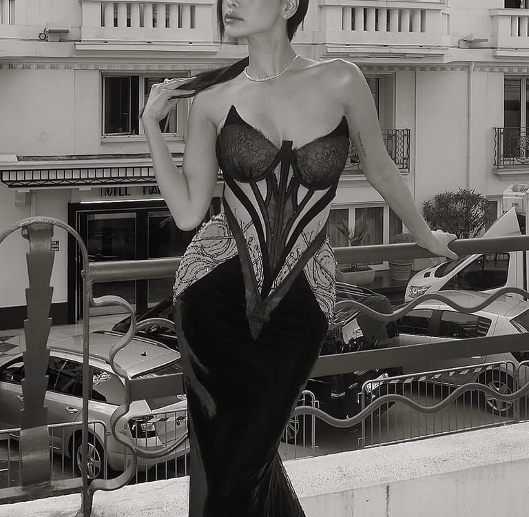 Engfa Waraha shone brightly in a nude dress that sparkled like an illusion under the Cannes lights. The gown's ethereal quality stemmed from intricate beadwork sewn onto sheer fabric, creating an enchanting design. With a plunging neckline, her décolletage received a gentle enhancement, while the flowing shape of the dress added grace and dynamism to her steps. Her flawless makeup showcased her beautiful skin and complemented her soft, smoky eyes, perfectly matching the gown's nude palette. Engfa's loose waves softened the striking outfit, beautifully encapsulating the festival's spirit with a stunning blend of modern allure and regal elegance.