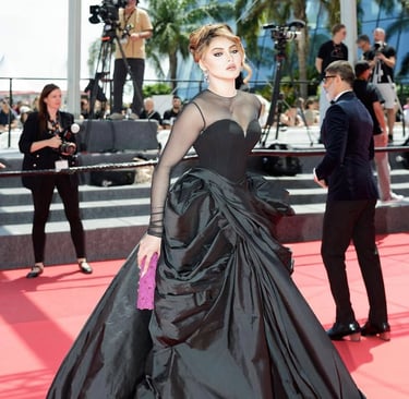 Angelina Usanova wore a breathtaking off-the-shoulder dress, beautifully decorated with what appeared to be crystals and sparkling details. These embellishments made the bodice look almost like armor, extending into the upper sleeves and creating a dramatic flair. Beneath the deep V-neckline, a sheer band offers a touch of modesty.