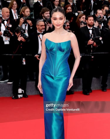 The fabric appears to be luxurious silk, giving the gown a gleaming finish and graceful drape. She adorned herself with stunning diamond accessories, including a delicate bracelet, a bold necklace, and eye-catching rings. Her chic updo keeps the focus on her outfit and radiant smile. This second appearance at the Cannes Film Festival showcases a fresh yet equally stylish side of her fashion.